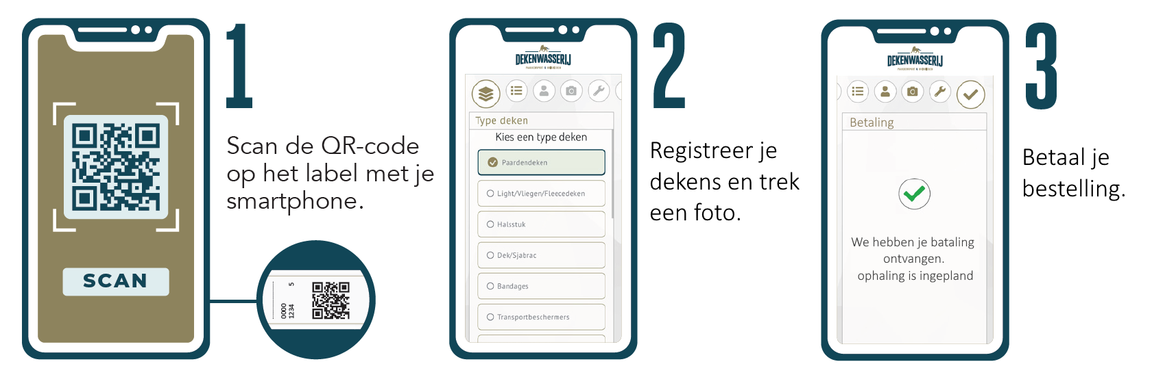 Via de QR-code kunnen gebruikers hun dekens registreren, waardoor ze zelf kunnen aangeven welke specifieke opties hun dekens nodig hebben, zoals bijvoorbeeld waterdichtheid of reparatie. Op het einde van de registratiecyclus wordt de betaling afgehandeld tussen de gebruiker en ons. Eventuele kosten voor reparaties worden apart gefactureerd aan de gebruiker na de voltooiing van de herstellingen.