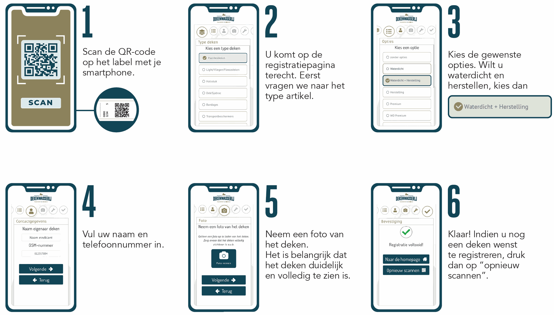 Onze labels zijn voor zien van een QR-code, via deze code kan je je dekens registreren en doorgeven welke opties je wil. Door je dekens te registreren kan je genieten van onze beste tarieven. Je ontvangt per deken een korting van 1€ incl. btw.*